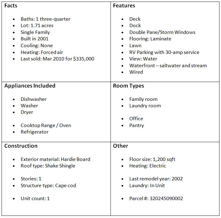 The size of the lot is 1.7 acres which is comprised of about a 1/4 forested land and the rest is house, lawn and waterfront. There is approximately 100′ of salt water waterfront and 400′ of ‘stream-front’. The western property line runs about 50′ beyond the general path of the stream. The incline to the salt water beach is mild and (with proper preparation) you can launch your water-toys directly from the property.